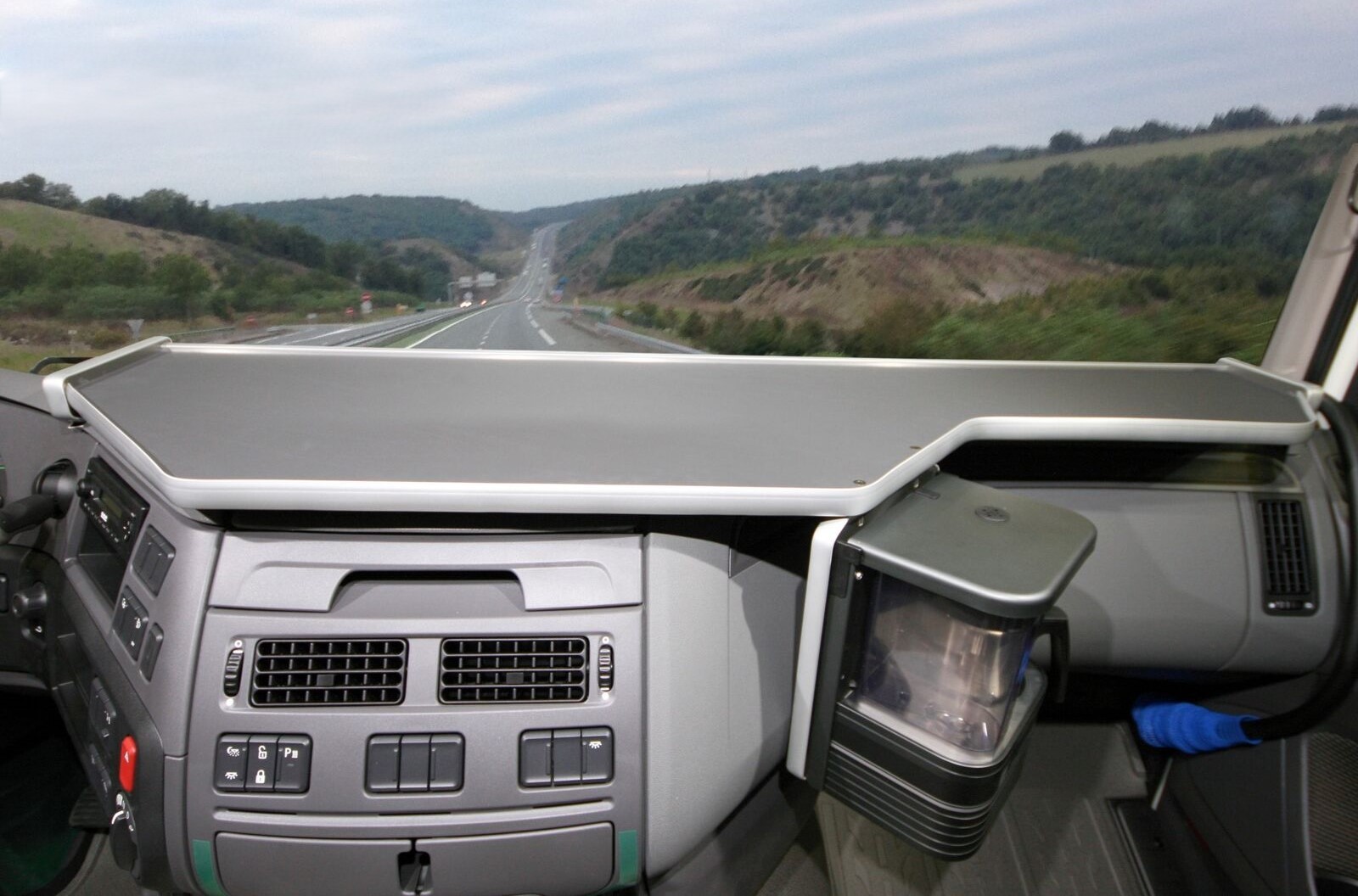 Pöytä XXL DAF XF Euro 6. 04/2013 ja uudemmat. Leveä pöytä keskeltä apukuljettajan puolelle Laminoitua vaneria, liukumista vähentävällä keinonahka pinnalla. Antrasiitin värinen kansi, mustilla reunoilla. Pöydän mukana on teline kahvinkeittimelle.