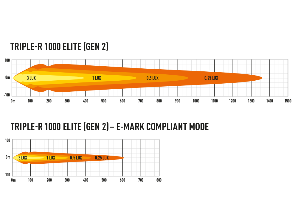 - 0.25lux: 1358 m / 607 m (Boost / E-hyväksytty)