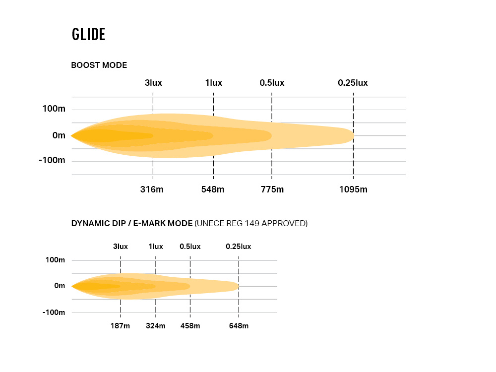 In-built within each Glide lamp is a Dynamic Dip mode which provides a smooth transition between high and low output modes. The low output mode permits driving in compliance with UNECE Regulation 149 (Double E-Mark) where local laws require, and/or a reduced output which for example reduces glare from highly reflective surfaces such as large road signs. The Dynamic Dip function is activated after the light has been on for >2seconds by simply and quickly flashing the light off and on again.
