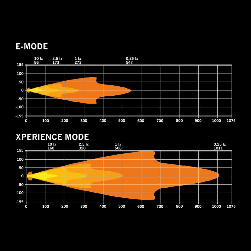 - Kantama @ 1 lux 506 m (Xperience), 273 m (E-mode)