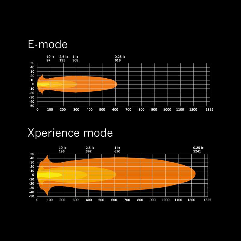 - Kantama 1 Lux: 308 m (E-mode), 620 m (Xperience mode)
