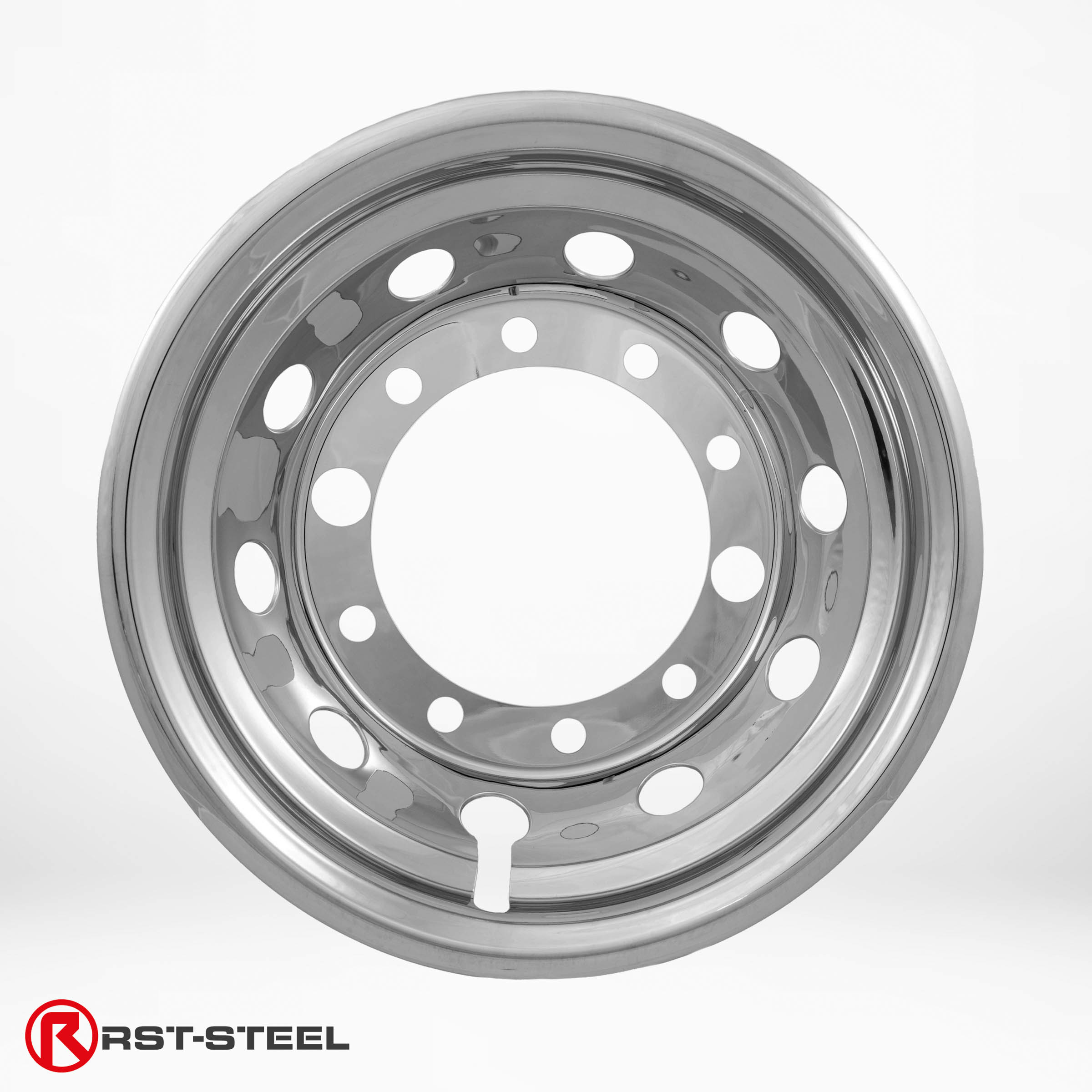 A pair of wheel covers made of stainless steel with an open center for 22.5″ rims