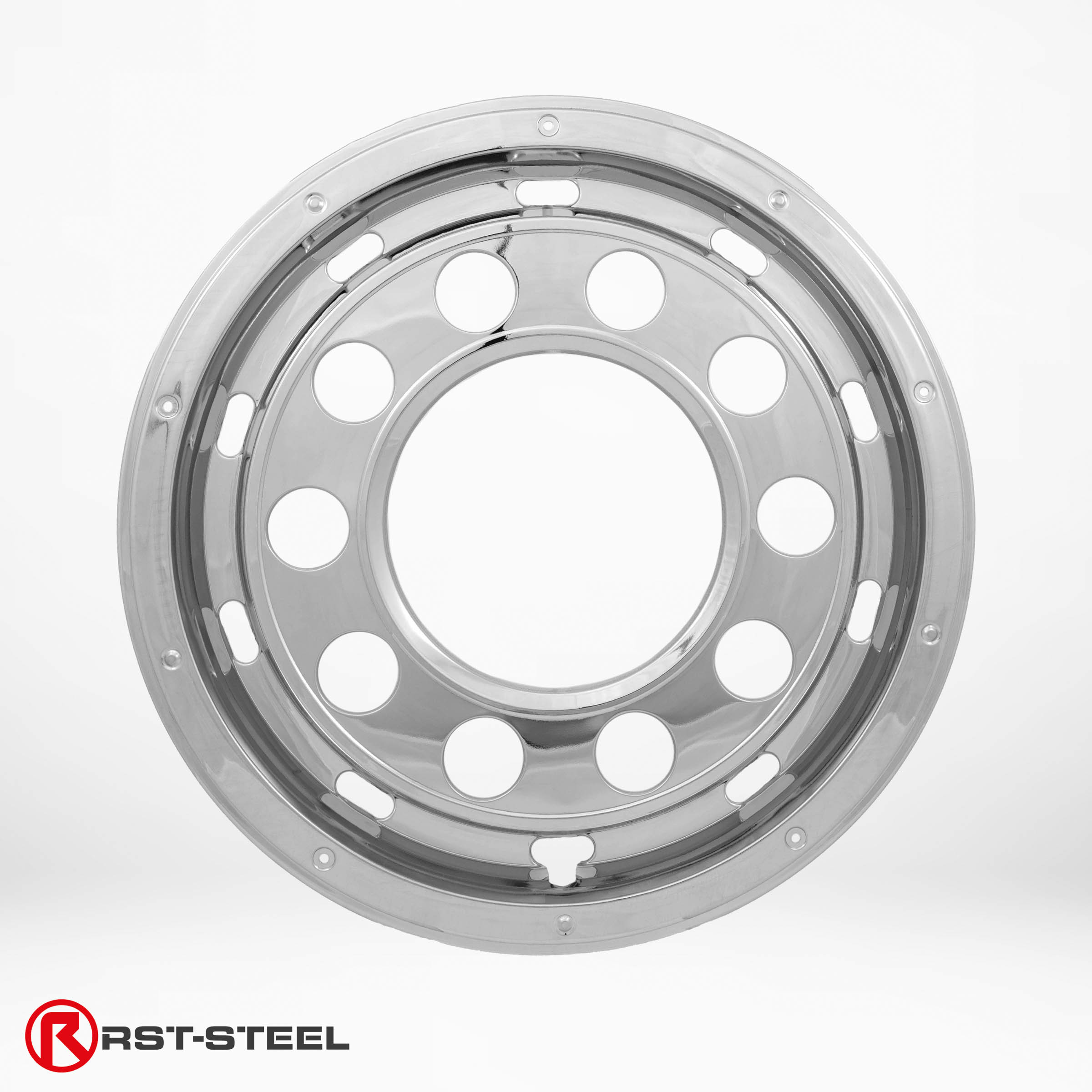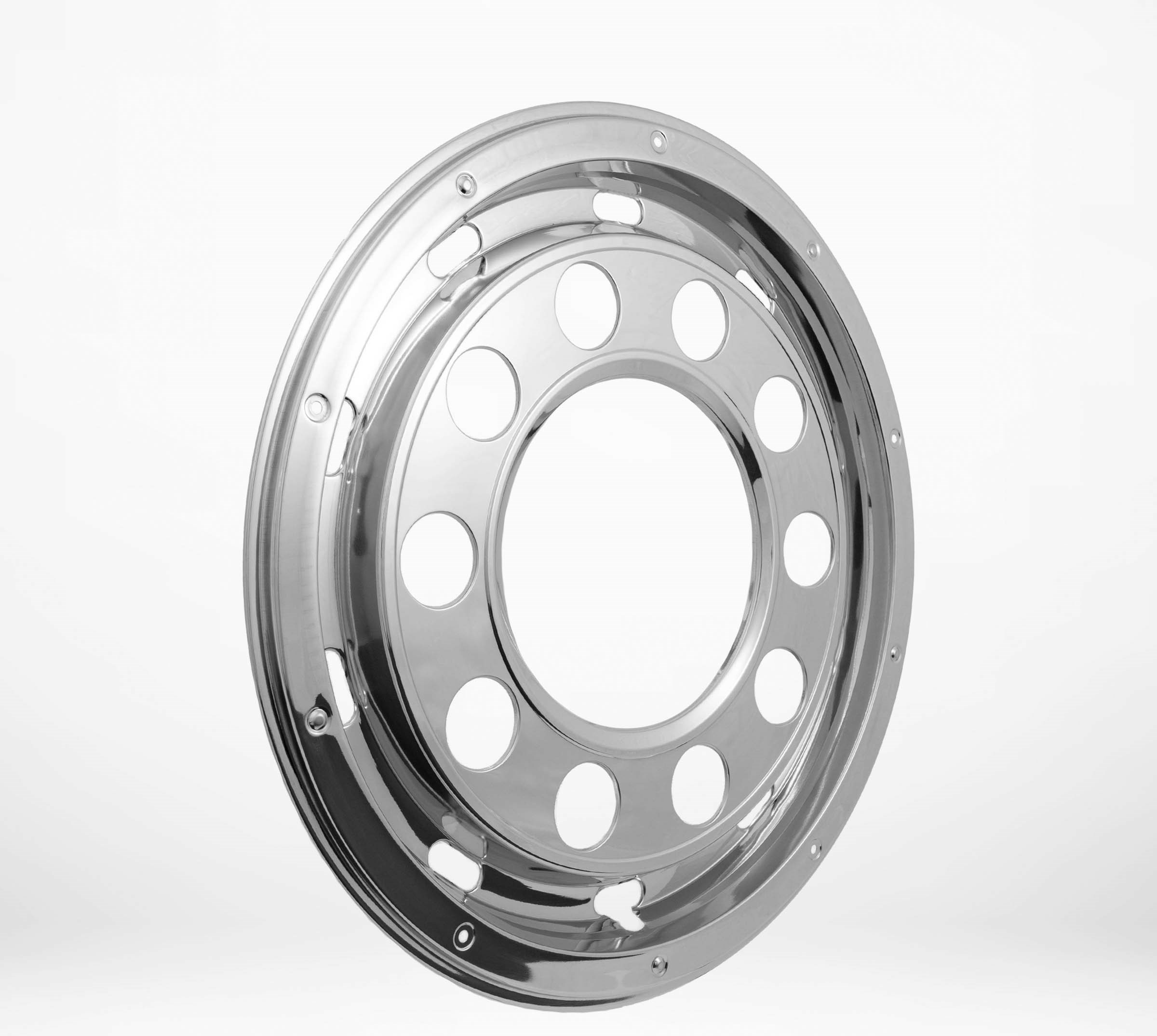 A pair of wheel covers made of stainless steel with an open center for 22.5″ rims