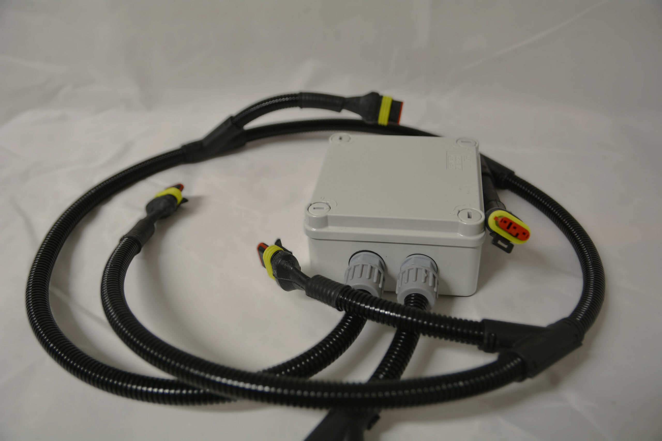The harness is suitable for up to four 250W auxiliary lights equipped with a 3-pin Superseal connector.